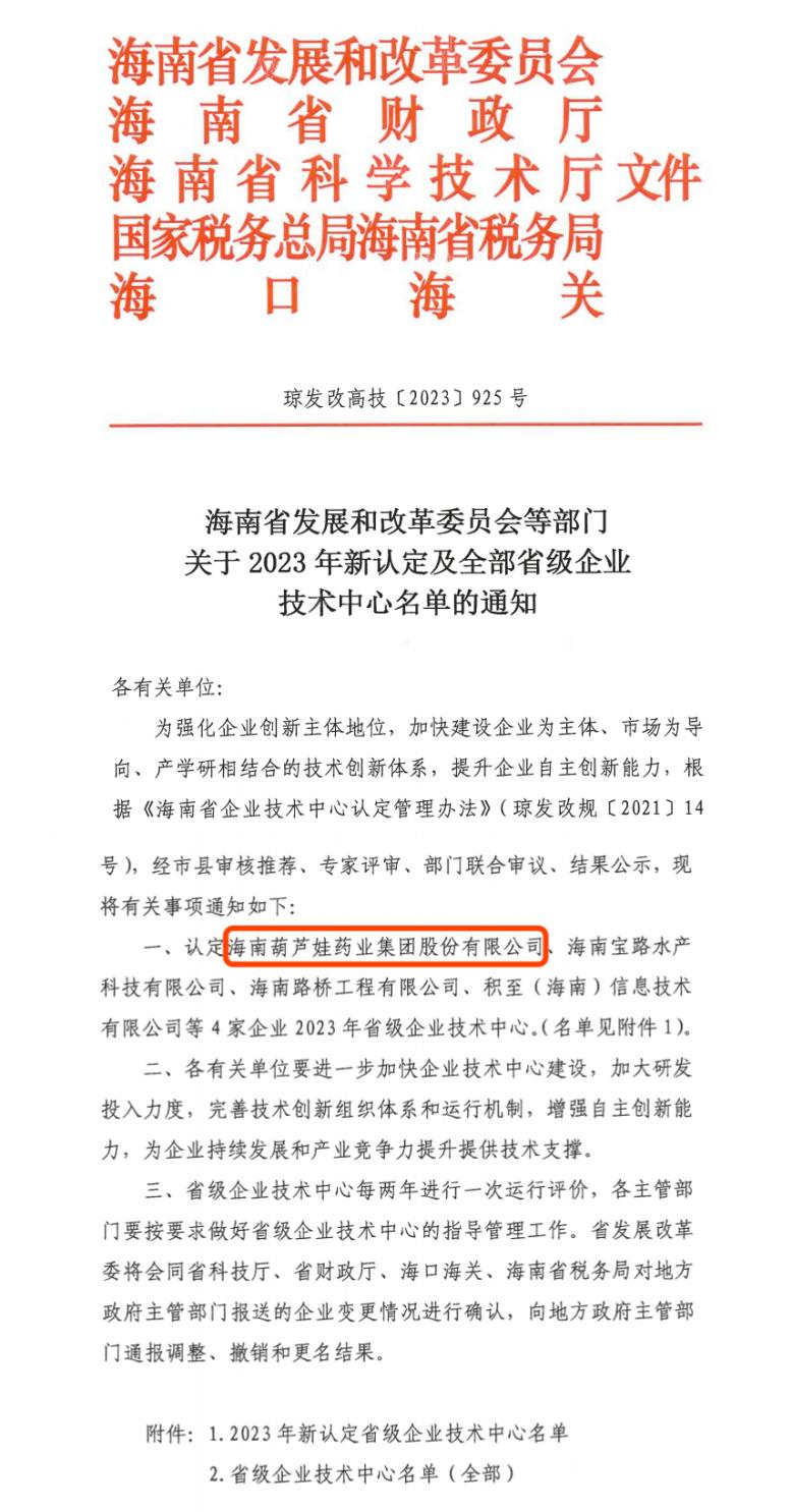 近日,海南省发改委等多部门联合公布了《关于2023年新认定及全部省级企业技术中心名单的通知》,其中,海南抖圈药业集团股份有限公司成功通过评审,被认定为省级企业技术中心,是本次获批的4家企业之一。